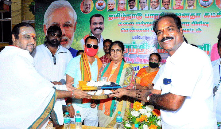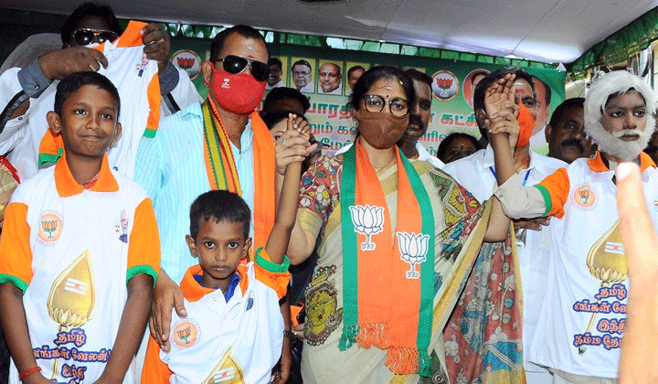 வெளிநாட்டில் மேடையேறி பேசும்போதெல்லாம் மோடி திருக்குறளை வைத்து பேசுவார் எனவே மோடி தமிழ் வளர்ப்பவர் இது போதாதென்று இந்தி மொழி கற்க வேண்டும் என்பதற்கு ஆதரவாக தமிழ் எங்கள் வேலன் இந்தி நம்ம தோழன் எனும் வாசகம் பொருந்திய டீ-சர்ட்டை வெளியிட்டு நரேந்திர மோடியின் பிறந்த நாளை கொண்டாடினார் நடிகை காயத்ரி ரகு ராம்.